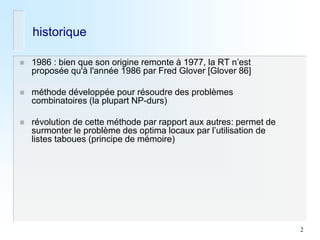 La recherche tabou, développée par Fred Glover en 1986, est une méthode itérative visant à résoudre des problèmes combinatoires en évitant les minima locaux grâce à une mémoire de mouvements interdits. Elle utilise des heuristiques pour sélectionner les mouvements à effectuer, en intégrant des techniques pour accélérer la recherche du meilleur voisin. Des mémoires à court, moyen et long terme sont également définies pour renforcer l'efficacité de la recherche en intensifiant et diversifiant l'exploration de l'espace de solutions.