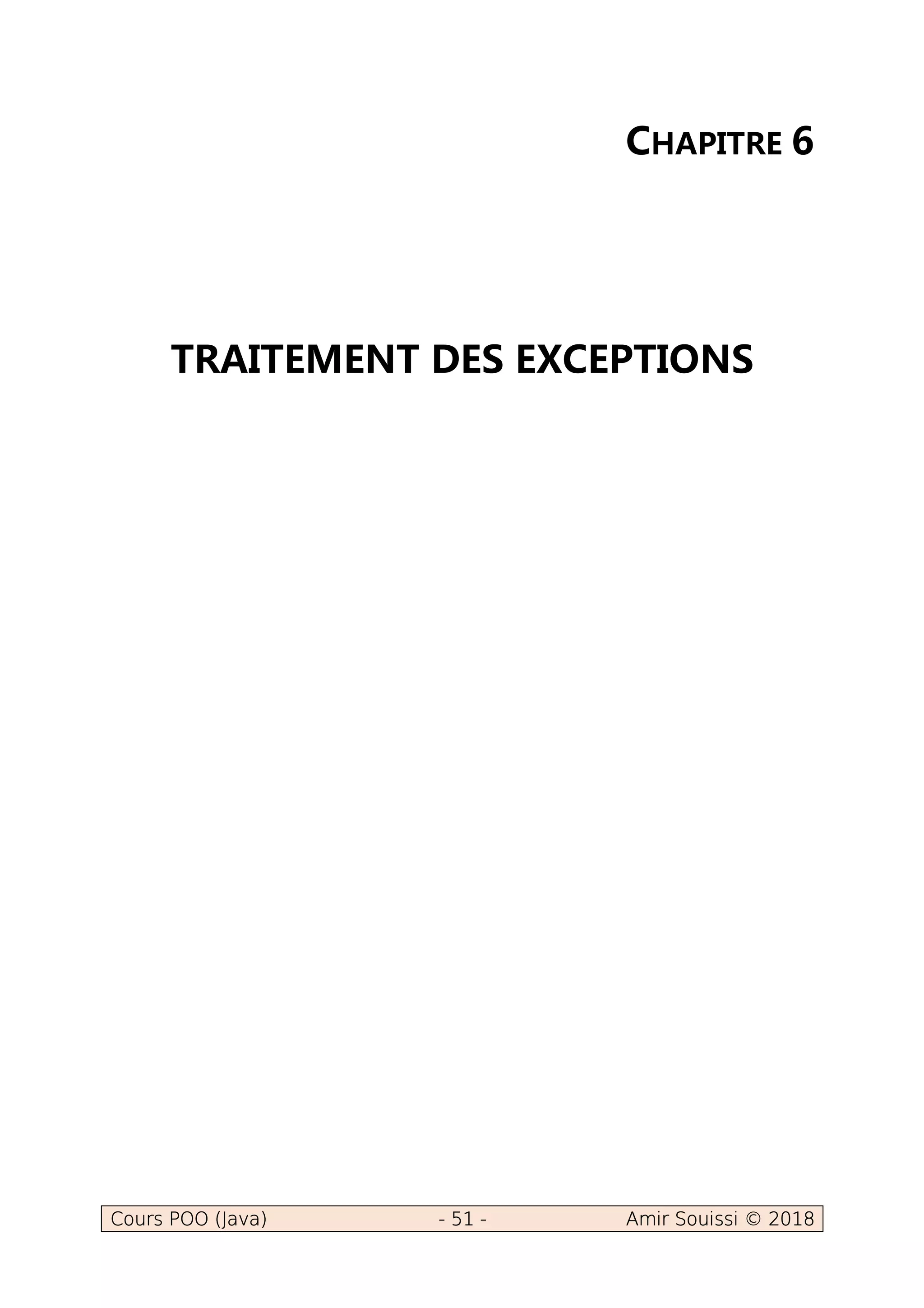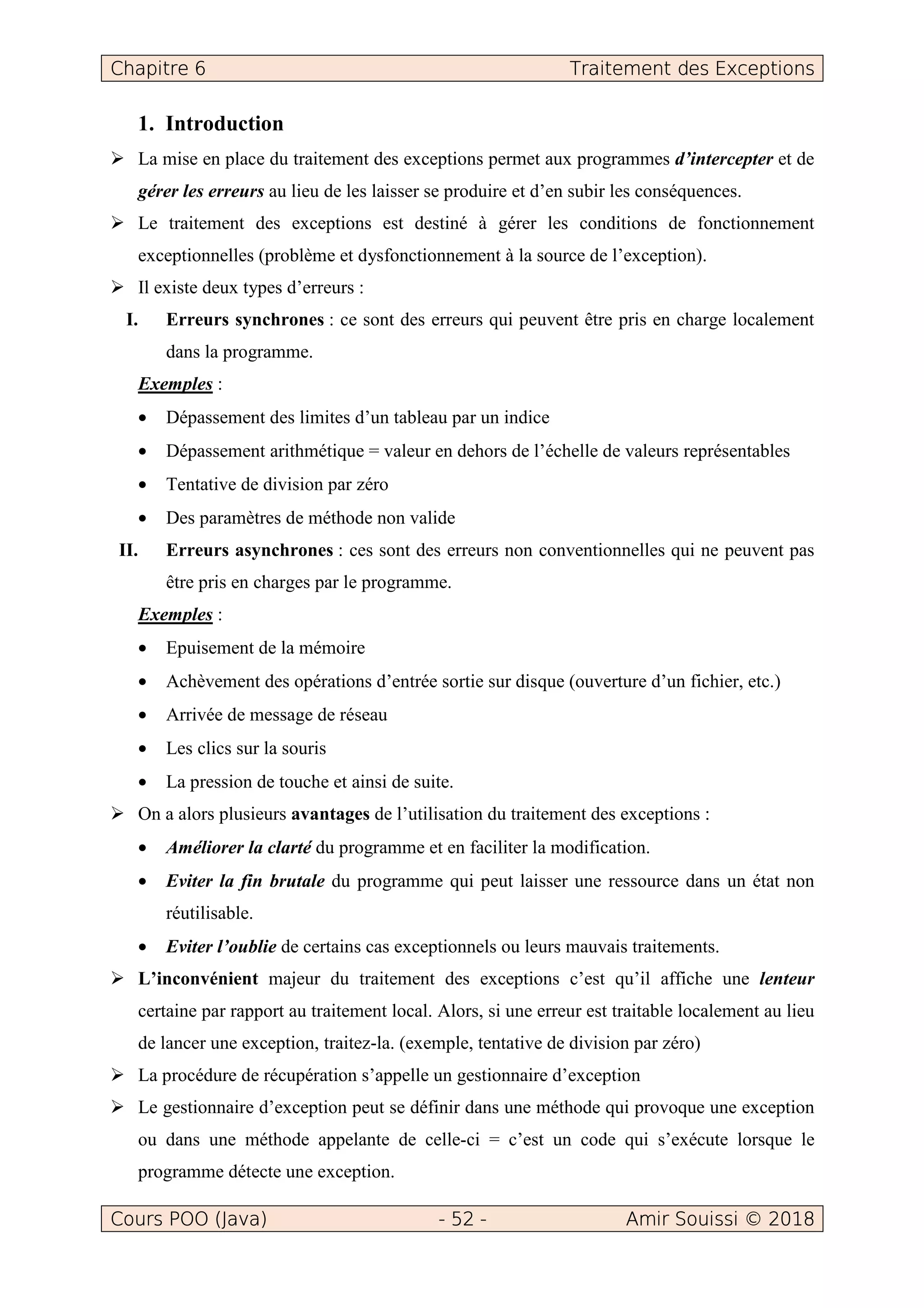 Le document aborde le traitement des exceptions en Java, expliquant comment gérer les erreurs à travers des blocs try, catch et finally. Il distingue les erreurs synchrones et asynchrones, détaille les types d'exceptions prédéfinies, et présente la syntaxe pour capturer et lancer des exceptions. Enfin, il inclut des exercices pratiques pour renforcer la compréhension du sujet.