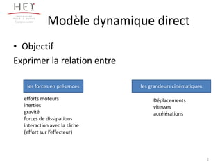 Le document traite des modèles dynamiques direct et inverse pour exprimer la relation entre diverses forces et les grandeurs cinématiques d'un système. Il examine les équations différentielles non linéaires et l'utilisation des formalismes d'Euler-Newton et de Lagrange pour évaluer les caractéristiques mécaniques des actuateurs. L'approche de Lagrange est décrite comme plus systématique mais plus complexe numériquement.