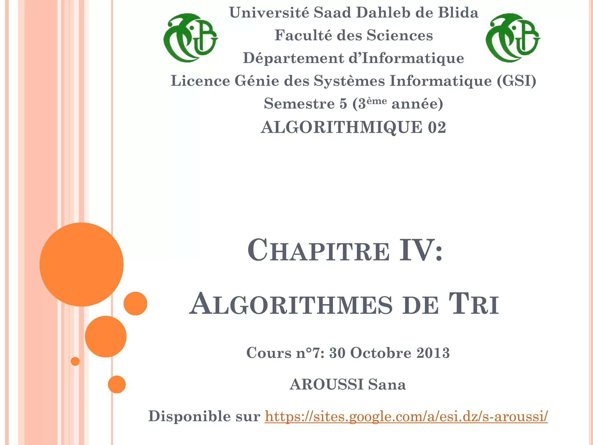 Le document est un cours sur les algorithmes de tri enseigné à l'Université Saad Dahleb de Blida, détaillant divers algorithmes tels que le tri par sélection, par insertion, par propagation, par fusion, rapide et par arbre binaire de recherche. Chaque algorithme est présenté avec son principe, son fonctionnement et sa complexité analytique. Le cours vise à concevoir ces algorithmes de manière récursive et à comprendre leur performance en termes de complexité temporelle.