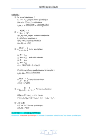 Ce document traite des formes quadratiques et des notions associées, telles que les formes polaires, la représentation matricielle, et les propriétés d'équivalence des formes quadratiques. Il aborde également des concepts de base orthogonale, de dimension, de rang, et de signature, tout en présentant des théorèmes sur la diagonalisation des formes quadratiques. Enfin, il classifie les formes quadratiques selon leurs propriétés positives et négatives.