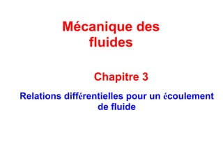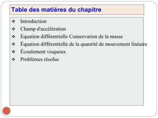 Le chapitre 3 traite des relations différentielles dans la mécanique des fluides, notamment l'accélération des fluides, la conservation de la masse et la quantité de mouvement linéaire. Il introduit des concepts clés tels que le champ de vitesse, l'accélération locale et convective, ainsi que les équations correspondantes pour des conditions d'écoulement spécifiques, y compris les fluides incompressibles. Les équations de Navier-Stokes et d'Euler pour différents types de fluides sont également discutées.