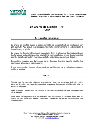 Vitogaz France recherche un chargé de clientèle en CDD pour son service à La Défense, responsable de la gestion complète d'un portefeuille client. Le profil recherché nécessite un baccalauréat minimum, une expérience en vente par téléphone, ainsi qu'une maîtrise du pack office. Les candidates doivent faire preuve d'un sens de l'organisation et de rigueur dans la gestion administrative des dossiers clients.