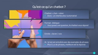 Les chatbots sont des interlocuteurs automatisés utilisant l'intelligence artificielle pour comprendre et répondre aux intentions des utilisateurs par le traitement du langage naturel. Ils sont de plus en plus courants grâce aux progrès récents dans la technologie et la popularité des plateformes de messagerie. Bien que leur efficacité soit mesurée et des limites existent, ils montrent un potentiel significatif pour automatiser des interactions à grande échelle.