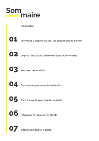 Ce document examine les meilleures pratiques pour transformer les visiteurs en clients fidèles dans le e-commerce, en mettant l'accent sur l'utilisation des données et des technologies telles que l'intelligence artificielle. Il souligne l'importance de l'expérience utilisateur, de l'adaptation aux attentes des consommateurs et de l'optimisation des chaînes d'achat. Plusieurs études de cas illustrent comment des entreprises ont réussi à améliorer leurs performances grâce à une meilleure stratégie de définition de leurs produits, une approche centrée sur le client et une utilisation efficace des données.