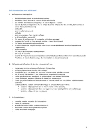 Le document fournit une checklist pour les chefs concernant les compétences requises pour le télétravail, soulignant l'importance de la communication, de l'autonomie et de la responsabilité. Il énonce également des critères pour sélectionner les télétravailleurs, notamment la nécessité d'une adéquation entre le collaborateur et la fonction. Enfin, il décrit des indicateurs positifs pour le télétravailleur et la nature des tâches pouvant être effectuées à distance.