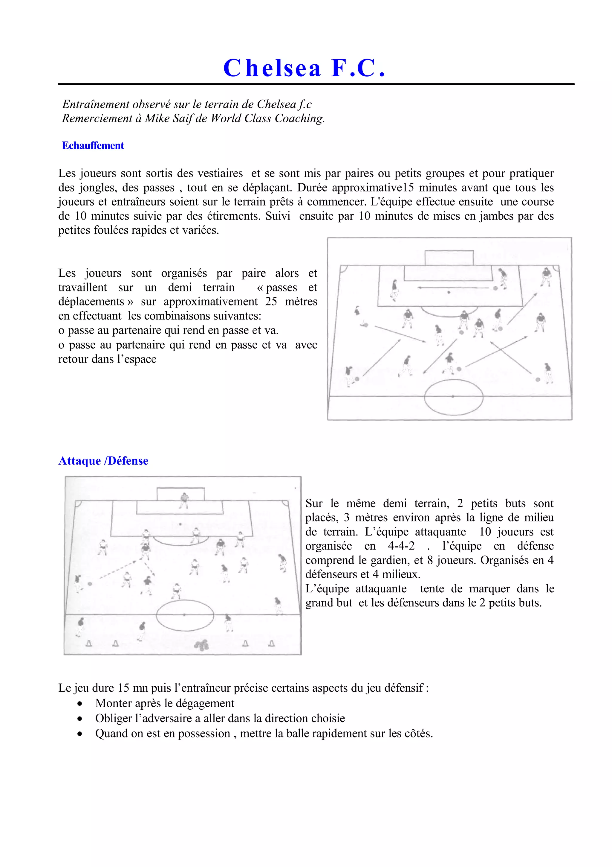 L'entraînement de Chelsea F.C. commence par un échauffement de 15 minutes où les joueurs pratiquent des jongles et des passes en se déplaçant. Ensuite, des exercices de combinaisons sont réalisés, incluant un jeu d'attaque et de défense durant lequel l'équipe attaquante tente de marquer dans le grand but tandis que les défenseurs se concentrent sur des petits buts. L'entraîneur met l'accent sur des stratégies de jeu défensif et des techniques de passes rapides pour conclure efficacement au but.