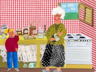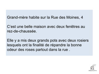 Le document décrit une visite de Noelia chez sa grand-mère où elles passent du temps ensemble à préparer des gâteaux et à s'occuper de leur chat, Bossi. Noelia partage ses deux histoires préférées et ses activités scolaires, tout en tissant un pull avec sa grand-mère. Elle éprouve de l'attachement à sa grand-mère mais ressent aussi de la tristesse à l'idée de partir chez ses parents.