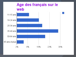 Les usages Webdes Internautes en France 0 10 20 30 40 50 60 70 80 90 100 Messagerie électronique Recherche d'informations sur des biens et services Compte bancaire Apprendre, enrichir ses connaissances Vacances Informations sur la santé Conversations, forums de discussion Vendre aux enchères Lire ou télécharger journaux ou magazines Télécharger des logiciels (autres que jeux) Rechercher un emploi 75 ans et plus 60-74 ans 45-59 ans 30-44 ans 15-29 ans Femmes Hommes Ensemble