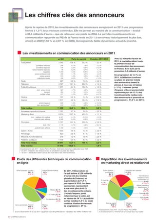 En 2011, les investissements des annonceurs en communication en France ont connu une légère hausse de 1,9 %, atteignant 31,4 milliards d'euros, mais la part du PIB consacré à ces investissements est restée à un niveau historiquement bas. Le marketing direct demeure le principal vecteur, alors que la télévision reste le média dominant, suivie par une forte progression des investissements en ligne. Les données montrent également une grande diversité dans les parts de marché des différents secteurs économiques en termes de dépenses publicitaires.
