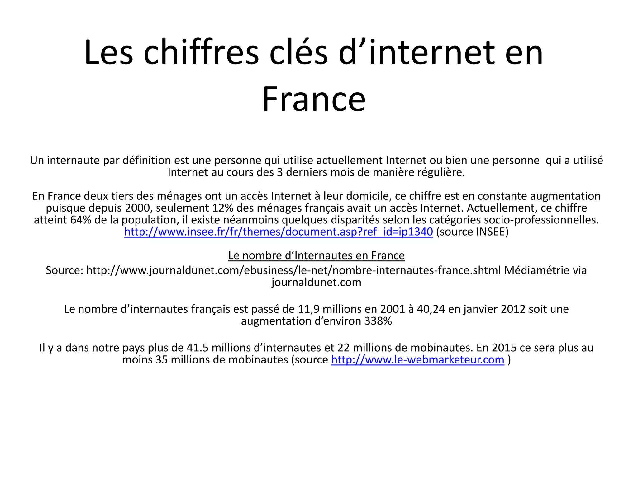 En France, environ 64% des ménages ont accès à Internet, avec plus de 41,5 millions d'internautes, dont 22 millions sont des mobinautes. L'usage d'Internet varie selon le sexe et l'âge, avec une augmentation constante des connexions et des achats en ligne, représentant une part significative de l'économie française. De plus, les internautes expriment des préoccupations concernant la protection de leurs données personnelles et considèrent Internet comme un outil essentiel pour rester en contact social et accéder à l'information.
