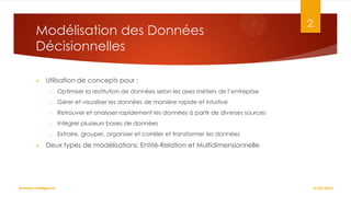 Ce document traite de la modélisation des données décisionnelles en intelligence d'affaires, en se concentrant sur les techniques de modélisation entité-relation et multidimensionnelle. Il explique les principes de normalisation pour optimiser les bases de données, les modèles de données nécessaires pour les entrepôts de données, et les aspects fondamentaux de la visualisation et gestion des données. Le document souligne également l'importance de la granularité, des dimensions et des hierarchies dans l'analyse des données.