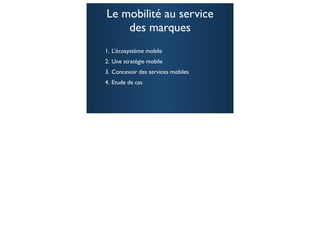 La présentation de Christophe Morawski aborde la stratégie mobile pour les marques, mettant en lumière l'importance de l'écosystème mobile, des terminaux et des comportements des utilisateurs. Elle explore des études de cas de succès, comme ING Direct et Taxi G7, soulignant l'impact d'applis bien conçues et la nécessité d'intégrer le mobile dans des stratégies multicanal. Enfin, elle mentionne les tendances futures concernant la digitalisation et l'innovation mobile.