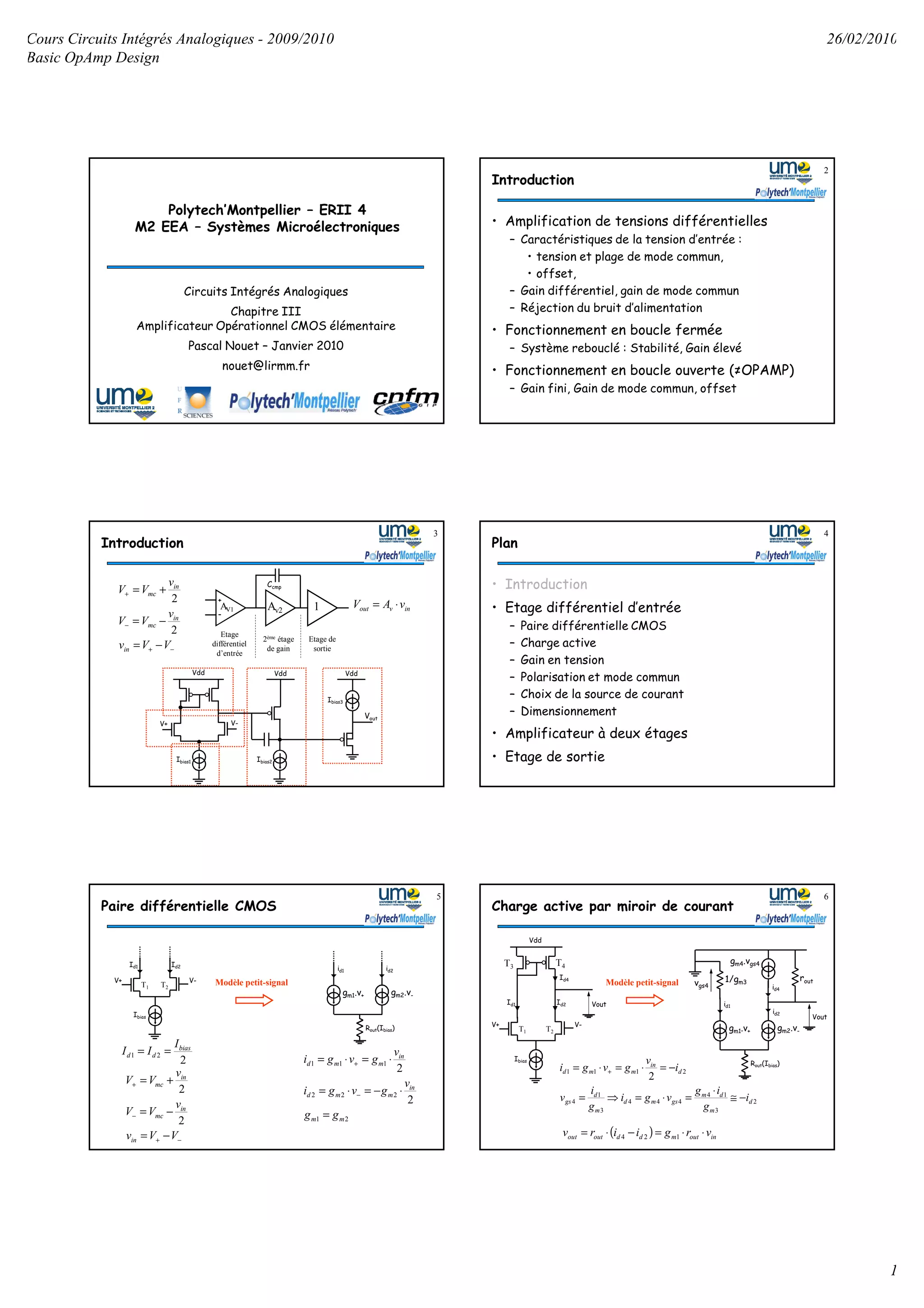 Ce document traite de la conception des amplificateurs opérationnels CMOS, incluant les principes d'amplification, les caractéristiques des étages différentiels, et les méthodes de dimensionnement pour optimiser le gain. Il aborde également la réponse en fréquence, les effets des résistances en sortie, et les implications sur la stabilité et les performances dynamiques. Des calculs et des simulations sont présentés pour illustrer les concepts discutés.
