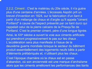 Le document traite du ciment, son histoire, sa fabrication et ses propriétés, notamment les différentes techniques de préparation et les matériaux nécessaires. Il met en évidence l'évolution du ciment à travers le temps, le processus industriel de production et les différents types de ciments disponibles. Les propriétés techniques et mécaniques du ciment Portland ainsi que ses applications dans la construction sont également expliquées.