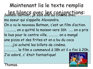 Le document propose un exercice sur l'utilisation des conjonctions et du passé composé pour relater une visite au cinéma. Il décrit les étapes de la préparation du récit, y compris la sélection des verbes et l'application des temps grammaticaux appropriés. En plus, il s'agit d'une activité collaborative où les élèves échangent des informations et vérifient les rapports de leurs partenaires.