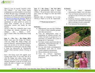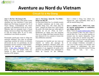 Le document présente un itinéraire de 5 jours pour une aventure au nord du Vietnam, incluant des visites de marchés hebdomadaires et des randonnées à travers des paysages montagneux à Ha Giang et Meo Vac. Les participants découvriront la culture locale et les traditions des différentes minorités ethniques tout en séjournant dans des hébergements variés, dont des maisons sur pilotis. Le voyage se termine par un retour à Hanoi après une immersion dans les magnifiques panoramas et la vie quotidienne des habitants.