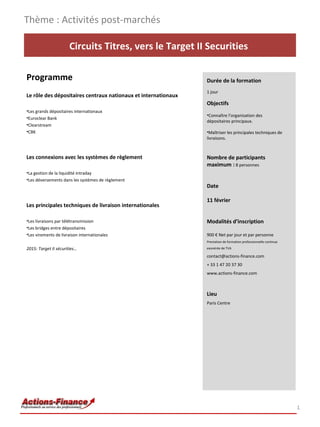 Le document présente une formation d'une journée sur les activités post-marchés relatives aux circuits titres, incluant le rôle des dépositaires centraux comme Euroclear Bank et Clearstream. Les objectifs incluent la compréhension des connexions avec les systèmes de règlement et des techniques de livraison internationales. La formation est limitée à 8 participants, avec un coût de 900 € par personne, se déroulant à Paris le 11 février.