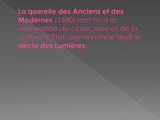 Le document explore les évolutions culturelles en France depuis la Renaissance, touchant l'architecture, la littérature et la philosophie, et présente des mouvements littéraires tels que le romantisme, le surréalisme et l'existentialisme. Il souligne l'importance des académies et analyse la quête d'originalité dans le nouveau roman et les thématiques de l'absurde et de la condition humaine. Enfin, il aborde le paysage musical et cinématographique français, mettant en avant la passion des Français pour la langue et les arts.
