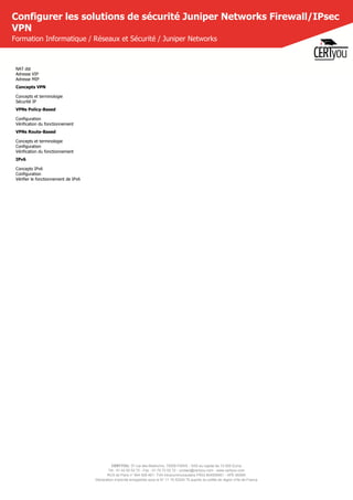 La formation proposée par Certyou enseigne la configuration des solutions de sécurité Juniper Networks, y compris les firewalls et les VPN, centrée sur le système ScreenOS. Destinée aux professionnels des réseaux, elle couvre des thèmes tels que la gestion du trafic, les règles de firewall, et les options de configuration avancées, durant une formation de 3 jours. Un soutien après le cours est inclus et un engagement de satisfaction à 100 % est garanti.