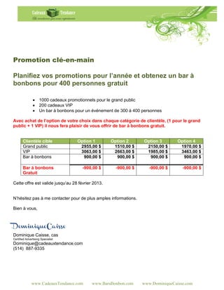 Cette offre promotionnelle inclut un bar à bonbons gratuit pour les événements de 300 à 400 personnes ainsi que divers cadeaux promotionnels pour le grand public et les VIP, disponibles jusqu'au 28 février 2013. Les options de cadeaux varient de bouteilles réutilisables à des stylos, des porte-clés et des chargeurs USB, avec des prix déterminés selon la quantité commandée. Les images et descriptions des articles, ainsi que les détails de la location des vases apothicaires pour le bar à bonbons, sont également fournis.