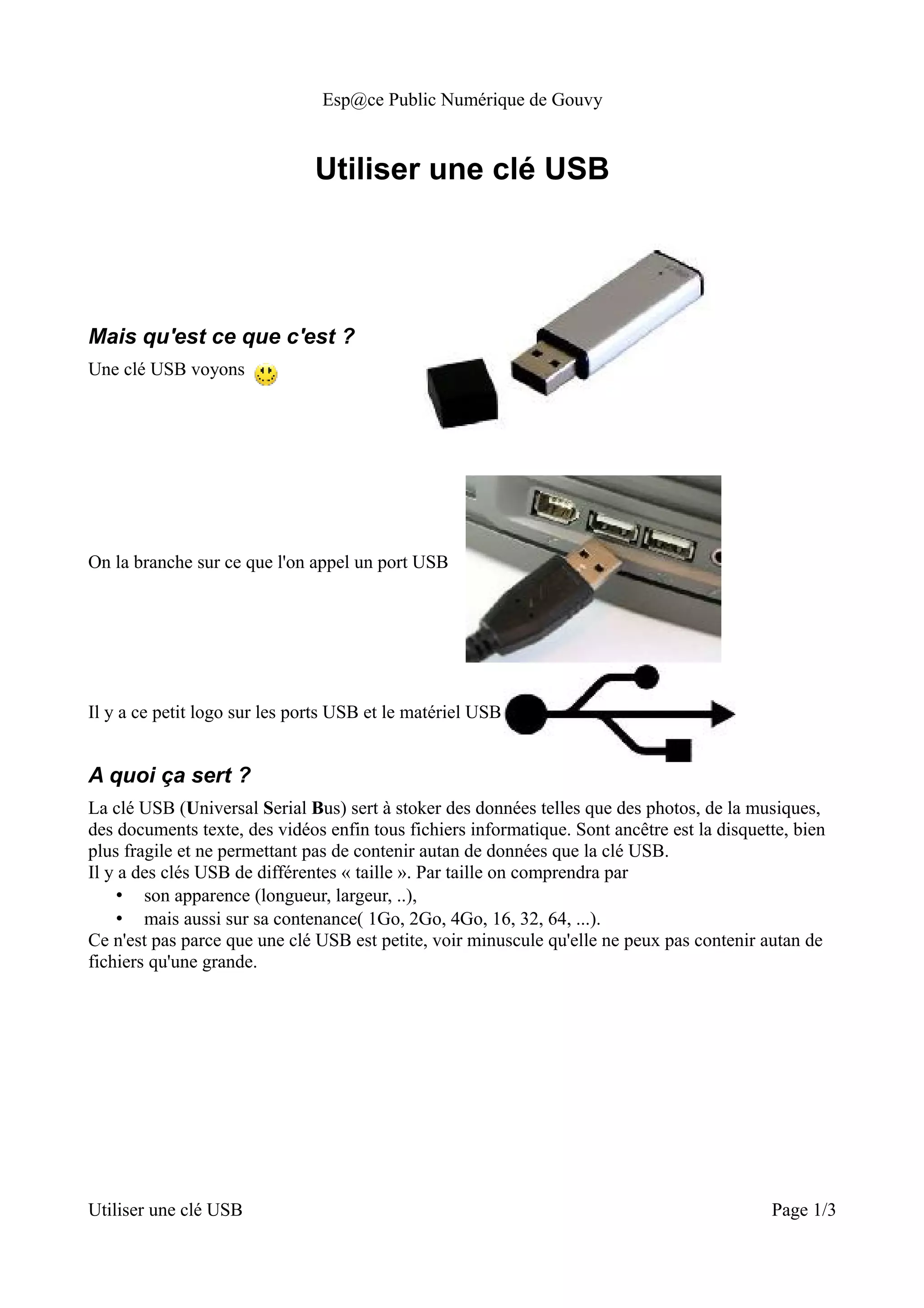 Une clé USB (Universal Serial Bus) est un dispositif de stockage de données permettant de transporter divers fichiers tels que des photos, musiques et documents. Pour l'utiliser, il suffit de la brancher sur un port USB et de gérer les fichiers comme dans un dossier normal, en veillant à l'éjecter correctement pour éviter la perte de données. Des instructions spécifiques pour éjecter une clé USB sous Windows XP et Windows 7 sont fournies.