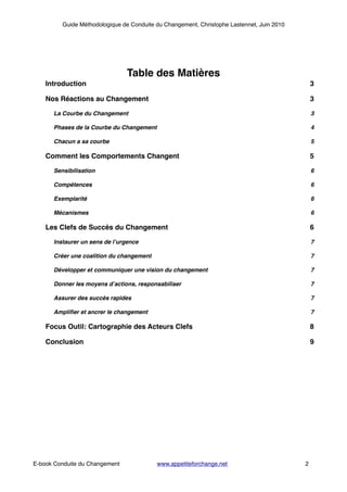 Le guide de Christophe Lastennet sur la conduite du changement présente une méthodologie pour réussir l'adhésion des acteurs clés à travers des approches pratiques et théoriques. Il explique les phases émotionnelles ressenties lors du changement, les facteurs influençant les comportements et les clés du succès, notamment l'instauration d'un sens d'urgence et la création d'une coalition. Enfin, il souligne l'importance de la sensibilisation et de l'engagement des différentes parties prenantes pour ancrer le changement durablement dans l'organisation.