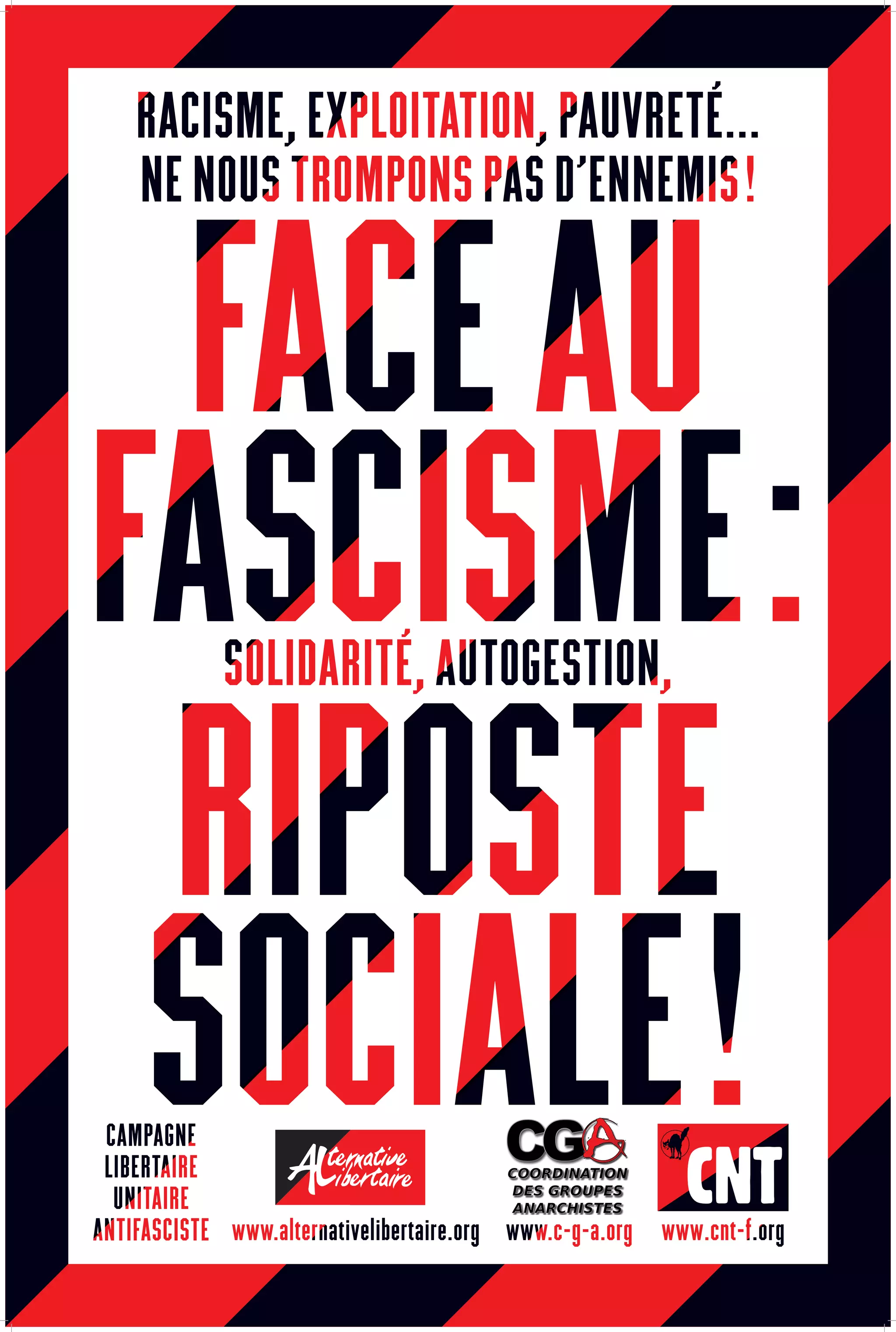 Face au fascisme: riposte sociale ! (CLAF 23 avril 2014) ========================================= Rappel ====== L'assassinat du jeune militant antifasciste, Clément Méric, le juin 5 dernier à Paris a médiatisé la violence des groupes fascistes en lien avec leur résurgence. Une réalité malheureusement bien trop connue par celles et ceux qui luttent au quotidien et sur le terrain contre le retour de la peste brune et plus généralement le développement et la banalisation des idées racistes, xénophobes, sexistes, patriarcales, homophobes, réactionnaires et autoritaires contenues et portées par le fascisme sous ces différentes expressions. L'extrême droite essaie de lisser son image et de séduire les travailleurs mais elle reste du côté des exploiteurs et continue de défendre un projet de société fondé sur l'exclusion, la soumission et la répression. Derrière des discours pseudo-sociaux et populaires se cachent en effet des idées réactionnaires et autoritaires. Un discours raciste, machiste et homophobe ========================================== Patriarcat et homophobie ------------------------- Pour l'extrême droite, les femmes devraient retourner à la maison et obéir au mari, et l’IVG ne devrait pas exister. Les homos, lesbiennes, bisexuel-lle-s ou transexuel-lle-s seraient "contre-nature" et ne devraient pas disposer des mêmes droits que les hétéros. Racisme -------- L'extrême droite veut supprimer le droit du sol, les allocations aux familles dont au moins l’un des parents n’est pas français, et expulser tous les sans-papiers, comme s'ils étaient responsables des méfaits du capitalisme. Religion --------- Leur prétendue défense de la laïcité n'est qu'un racisme masqué. Ils ne se servent de ce concept que dans un but : affirmer la primauté de leurs idées au détriment de toutes les autres… Violence et autoritarisme =========================== Etatisme autoritaire --------------------- Le fascisme c’est le règne du grand capital allié un Etat répressif chargé de faire régner l’ordre au profit d’une classe de profiteurs. Culte du chef ------------- La société d'extrême droite, c'est une société pyramidale où les chefs décident de tout, s’accaparent toutes les richesses et réduisent au silence les dissidents. L’Etat est là pour encadrer l'exploitation. La violence comme mode de gouvernement --------------------------------------- Pénalisation, répression, toutes les armes de l'Etat sont mises au service de la domination. C’est la haine de ceux qui vivent différemment, la guerre et le flicage : multiplication des caméras de surveillance, augmentation du budget de l’armée, création d’une milice. Un discours fondé sur la peur et la haine ----------------------------------------- Dans un contexte de crise, d’inégalités, de chômage et de précarité grandissante, taper sur les immigrés, ceux et celles qui