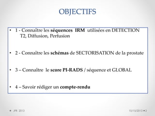 Le document traite de la classification PI-RADS dans le diagnostic du cancer de la prostate à l'aide de l'IRM multiparamétrique, abordant les séquences IRM, la sectorisation de la prostate et le système de notation PI-RADS. Il décrit les séquences recommandées pour la détection et l'évaluation des lésions prostatiques ainsi que la méthodologie pour attribuer des scores de risque. Enfin, il présente des recommandations pratiques pour la rédaction des rapports d'IRM prostatique.