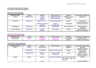 Le document présente une classification des bactéries basée sur leur morphologie, avec des exemples de genres et d'espèces, ainsi que leurs habitats et pouvoirs pathogènes. Il couvre plusieurs catégories, y compris les coques, les bacilles et les bactéries anaérobies, en détaillant des pathogènes spécifiques comme Staphylococcus aureus, Streptococcus pneumoniae et Escherichia coli. La taxonomie des bactéries est essentielle pour comprendre leur rôle dans les infections humaines et animales.