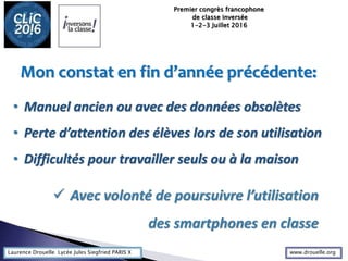 Le document traite des expériences de Laurence Drouelle lors du premier congrès francophone de classe inversée en juillet 2016. Elle évoque l'utilisation des smartphones en classe et les outils numériques pour favoriser l'apprentissage individuel et collaboratif des élèves. Les témoignages de l'impact de la pédagogie de classe inversée montrent une amélioration des relations affectives et des méthodes d'apprentissage.