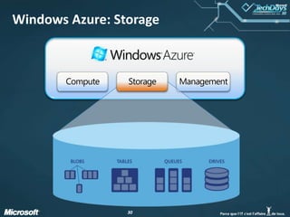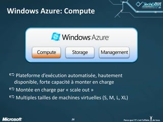 La présentation du 8 février 2010 sur Windows Azure couvre les types de cloud computing, les scénarios d'utilisation, et offre un aperçu des composants de la plateforme Azure, y compris le calcul, le stockage et la gestion des données. Elle aborde également les services SQL Azure et AppFabric, ainsi que les avantages d'une infrastructure cloud pour optimiser les performances et gérer les pics de demande. Enfin, des cas d'utilisation et différentes options de tarification sont présentés pour illustrer la flexibilité et l'évolutivité d'Azure.