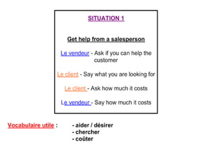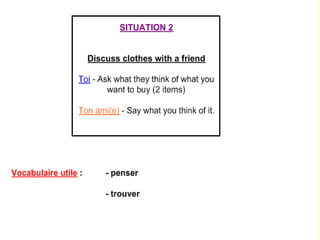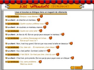 Le document enseigne le vocabulaire nécessaire pour faire du shopping de vêtements dans un pays francophone. Il présente des expressions courantes pour les tailles, les essais, et les dialogues en magasin. Enfin, il inclut des exemples de dialogues à réorganiser pour pratiquer la conversation.