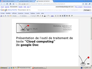 Le document compare l'utilisation d'une suite bureautique sans et avec le cloud computing. Il souligne les avantages du cloud, tels que l'accès à distance, la collaboration en ligne et la réduction des coûts. En revanche, l'utilisation sans cloud nécessite un matériel plus puissant et des sauvegardes locales.