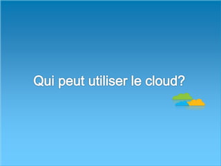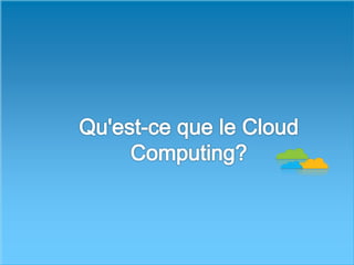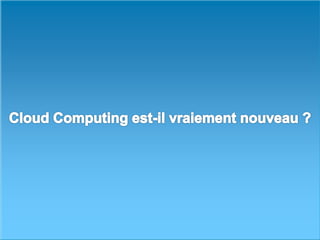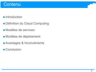 Le document explore le concept de cloud computing, définissant son modèle, ses services, et son évolution depuis ses débuts avec des précurseurs comme Salesforce en 1999 jusqu'à des services majeurs comme Amazon Web Services. Il détaille également les modèles de déploiement (public, privé, hybride) et de service (SaaS, PaaS, IaaS), ainsi que les avantages et inconvénients, notamment l'accès à la demande, l'élasticité, et les préoccupations de sécurité. Enfin, il conclut sur l'importance croissante du cloud computing dans le secteur technologique et la nécessité de plans d'implémentation efficaces.