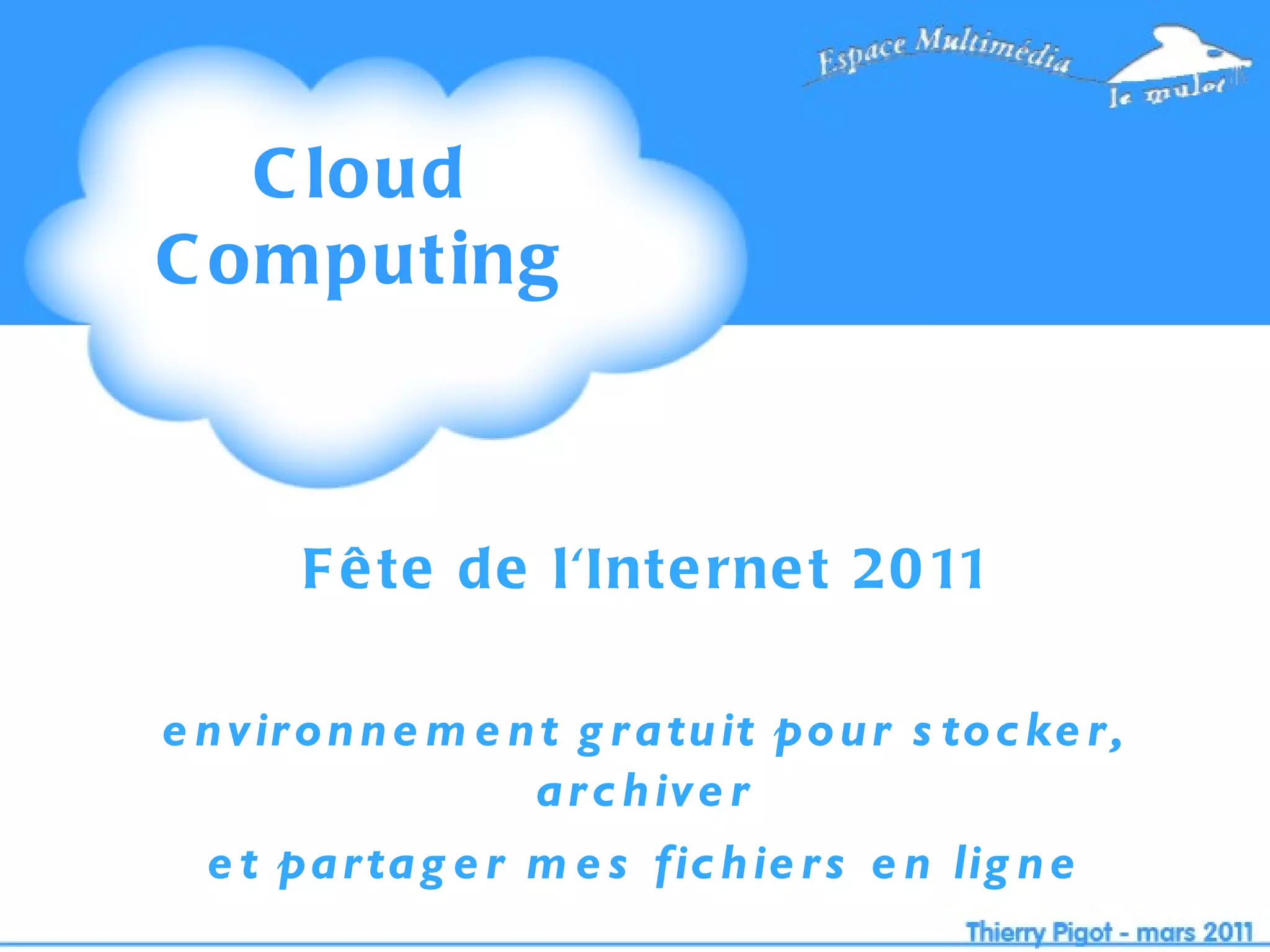 Le cloud computing permet de stocker, archiver et partager des fichiers en ligne via des serveurs interconnectés. Ce système offre des avantages tels que l'extensibilité des ressources et la réduction des coûts, mais présente des inconvénients liés à la sécurité et à la pérennité des services. Plusieurs applications comme Dropbox, Digiposte et Evernote illustrent son utilisation pratique pour la sauvegarde et l'organisation de données numériques.