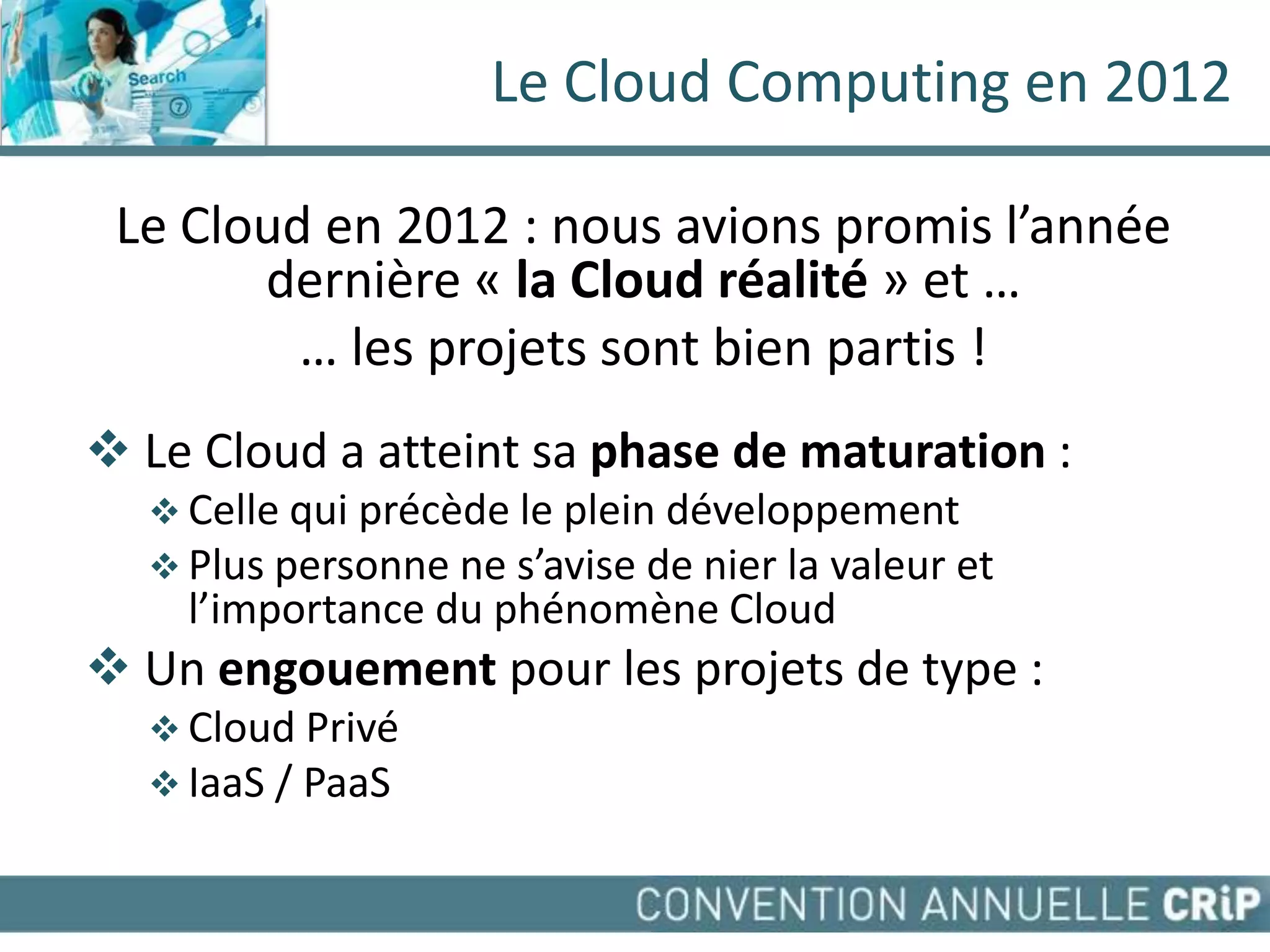 Le groupe cloud computing, dirigé par Stéphane Geissel et Patrick Joubert, a atteint une phase de maturation en 2012, avec un engouement pour les projets de cloud privé et de services IaaS/PaaS. La publication de leur troisième livre blanc, contenant des chapitres sur la sécurité, la facturation, et des retours d'expérience, témoigne de l'activité dynamique dans ce domaine. Les perspectives pour la saison 4 incluent des discussions sur les impacts des ressources humaines, l'hybridation des services cloud, et les modèles d'engagement.