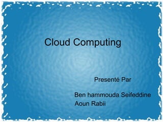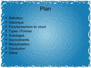 Le cloud computing est une technologie permettant de délocaliser des données et applications sur des infrastructures accessibles via Internet, avec des modèles de services tels que SaaS, PaaS et IaaS. Il offre des avantages comme la puissance de calcul à la demande et l'optimisation des coûts, mais présente également des inconvénients liés à la sécurité des données. Son évolution depuis les années 1950 promet d'influencer significativement l'hébergement et le développement des applications.