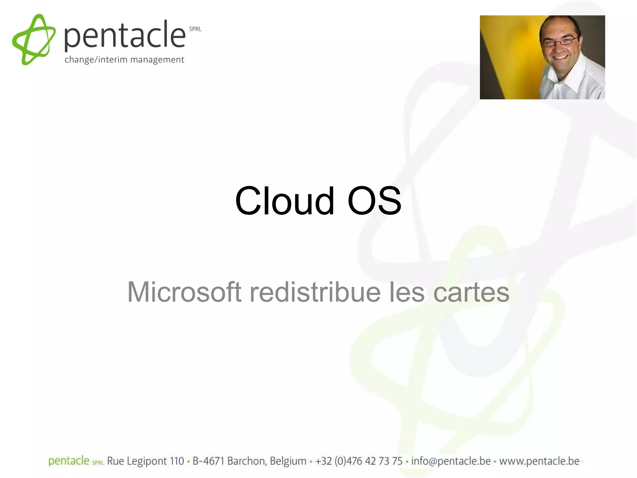 Le document présente une réflexion sur le 'Cloud OS', détaillant son évolution, ses caractéristiques et son utilisation dans le contexte des systèmes d'exploitation modernes, notamment ceux proposés par Microsoft. Alain Leroy, expert en technologies, aborde les implications du Cloud OS dans les entreprises, incluant des aspects comme la virtualisation et la gestion des identités. L'approche de Microsoft vis-à-vis du Cloud OS est alignée avec les tendances actuelles d'externalisation et d'utilisation basée sur les services.