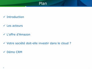 Le document présente le cloud computing comme une solution pour les entreprises, permettant de réduire les coûts liés à l'infrastructure en optant pour des services externalisés comme ceux d'Amazon. Il décrit les offres d'Amazon Web Services, telles que l'EC2 et le S3, ainsi que des cas d'utilisation concrets dans des organisations comme l'armée américaine et General Electric. Enfin, il souligne l'importance croissante du cloud dans la transformation des opérations des entreprises.