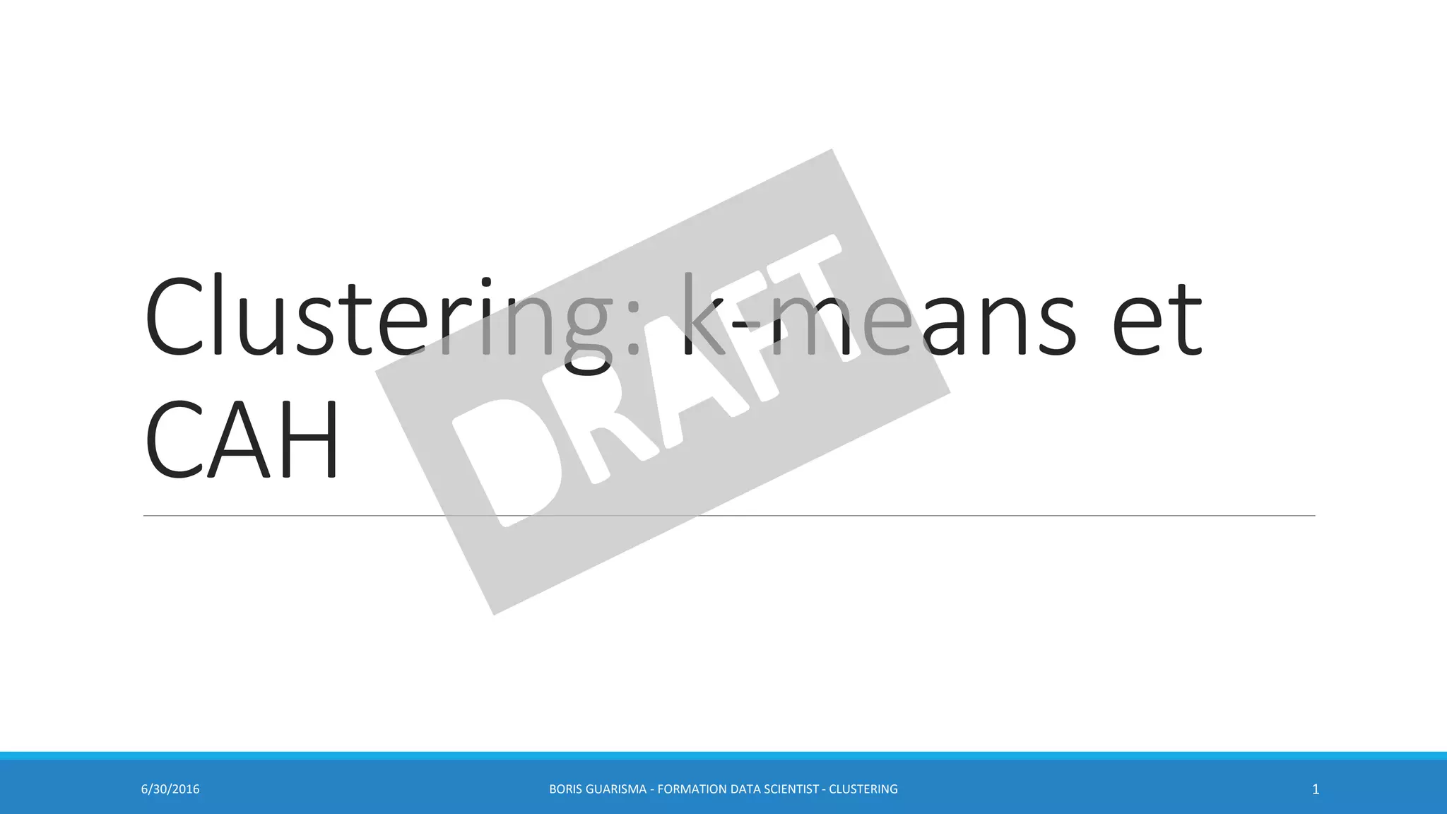 Ce document traite des méthodes de clustering, principalement le k-means et la classification ascendante hiérarchique (CAH), en détaillant leurs algorithmes, applications et mesures de performance. Il souligne la différence entre l'apprentissage supervisé et non supervisé, ainsi que l'importance de la distance et de la similarité dans le regroupement des données. Enfin, des pratiques pour déterminer le nombre optimal de clusters et des considérations sur leurs avantages et inconvénients sont également abordées.