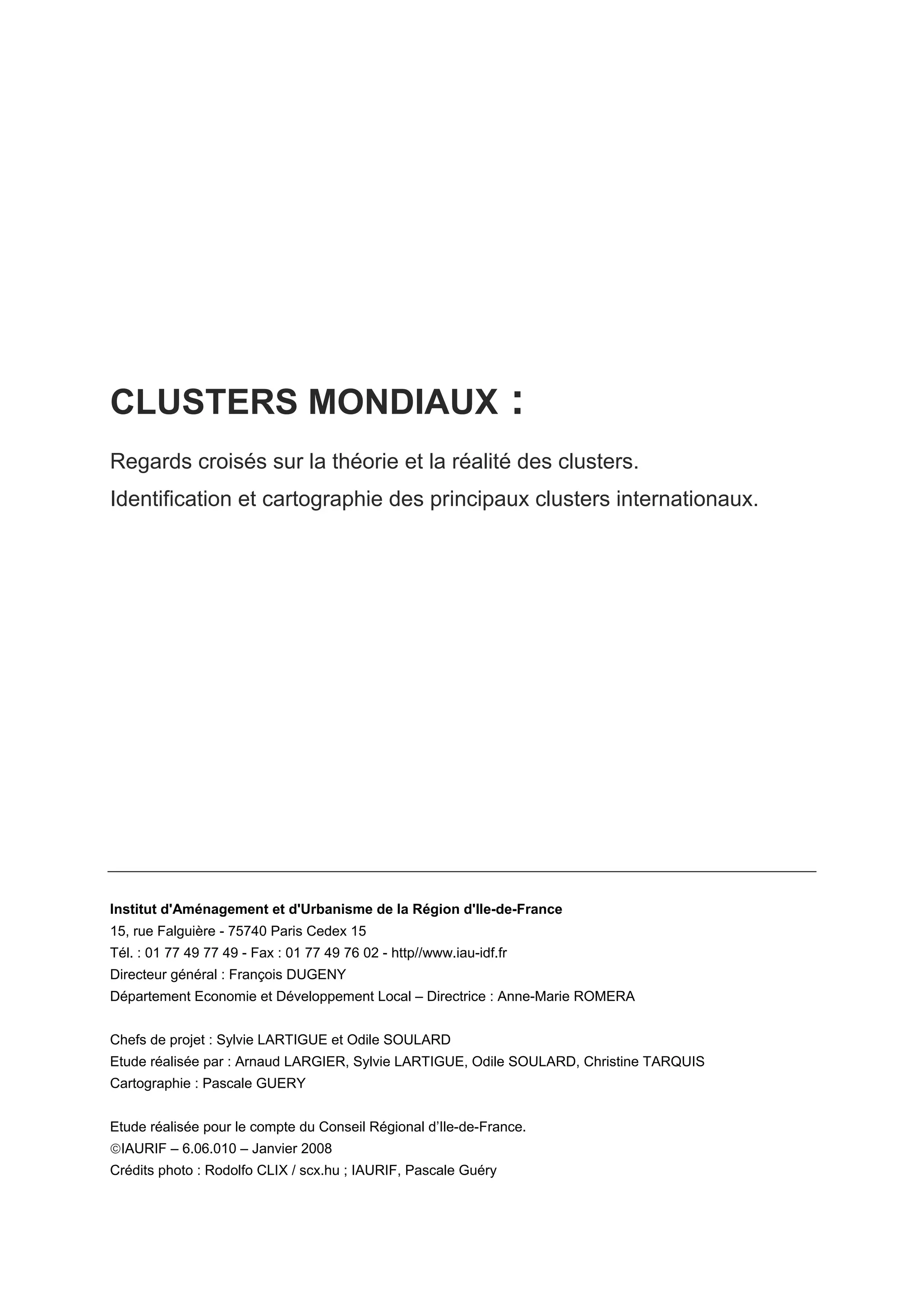 Le document explore la théorie et la réalité des clusters, leur identification et cartographie à l'échelle mondiale, ainsi que leur impact sur l'économie régionale. Il examine les bénéfices et les limites des clusters, tout en présentant des exemples de politiques et d'initiatives à travers le monde. L'étude vise à clarifier le concept de cluster et à guider la stratégie de développement économique de la région Île-de-France.