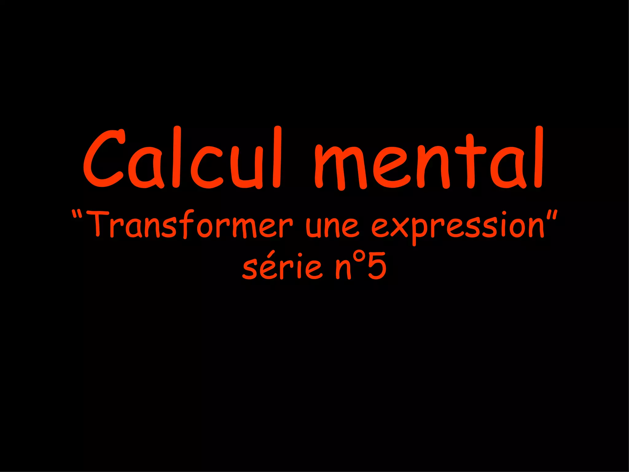 Le document présente un exercice de calcul mental sur le thème de 'transformer une expression' avec cinq diapositives. Les réponses aux affirmations de chaque diapositive sont classées comme vrai ou faux. La majorité des réponses indiquent que les affirmations sont fausses, indiquant une impossibilité de réduire plusieurs expressions.