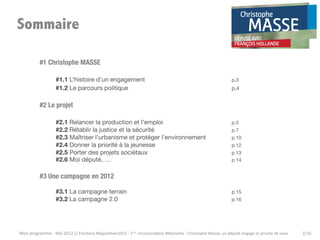 Christophe Masse, candidat aux élections législatives de 2012 dans la 1ère circonscription de Marseille, propose un programme axé sur la relance de l'emploi, la sécurité, et un développement urbain respectueux de l'environnement. Il souhaite travailler aux côtés de François Hollande pour apporter des changements significatifs, notamment en augmentant les effectifs de police et en favorisant la création de contrats de génération. Son engagement est de redonner espoir aux habitants de Marseille par un dialogue direct et une présence sur le terrain.
