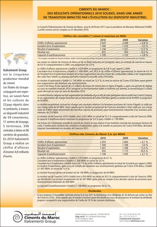 Ciments du Maroc a enregistré des résultats opérationnels solides en 2010, malgré une baisse du résultat d'exploitation de 12,5 % à 1 156 MDH, due à l'augmentation des coûts liés à une nouvelle usine. Le chiffre d'affaires opérationnel a légèrement augmenté de 0,8 % à 3 629 MDH, avec une capacité d'autofinancement qui a progressé de 3,8 % pour atteindre 1 199 MDH. Le résultat net a cependant diminué de 10,2 % à 872 MDH par rapport à l'année précédente.