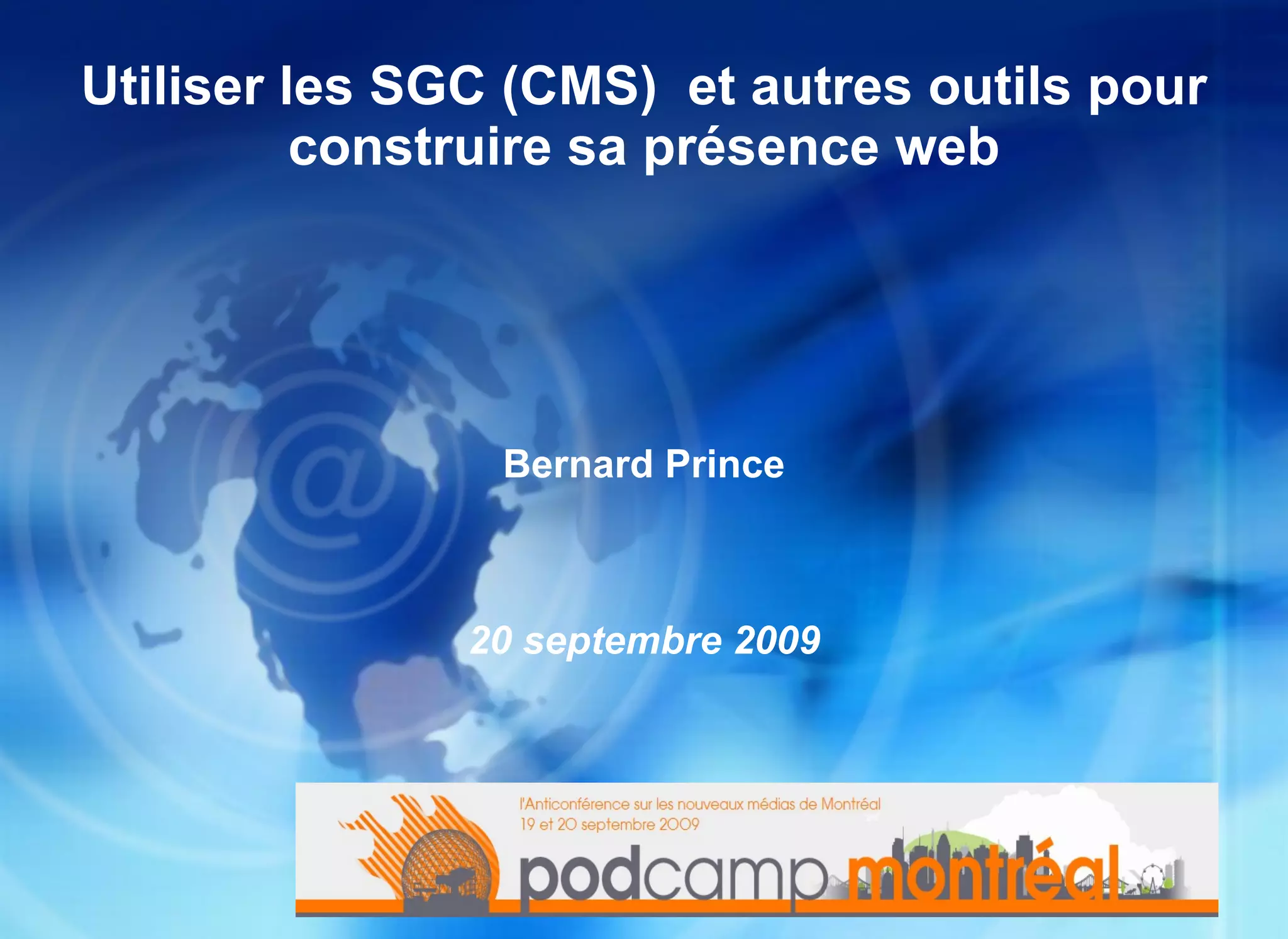 Le document traite de l'utilisation des systèmes de gestion de contenu (SGC), notamment leur rôle dans le développement de la présence en ligne pour les PME et les travailleurs autonomes. Il présente les caractéristiques des SGC, leurs avantages par rapport aux options payantes, et les étapes pour créer un site web en utilisant ces outils. Des exemples de SGC populaires comme WordPress, Joomla et Moodle sont également mentionnés, soulignant leur accessibilité et leurs fonctionnalités adaptées aux utilisateurs sans compétences techniques avancées.