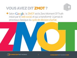 Le document explique comment le web social a transformé le cycle d'achat traditionnel en introduisant le concept de ZMOT (zero moment of truth), où les consommateurs recherchent et partagent des avis avant et après leurs achats. Il propose des stratégies pour les marques afin de gérer leur e-réputation, de réaliser du marketing sur les réseaux sociaux et d'utiliser le social CRM pour mieux comprendre et engager les clients. En résumé, il s'agit d'une adaptation nécessaire des entreprises au nouvel environnement numérique et social dans la prise de décision des consommateurs.