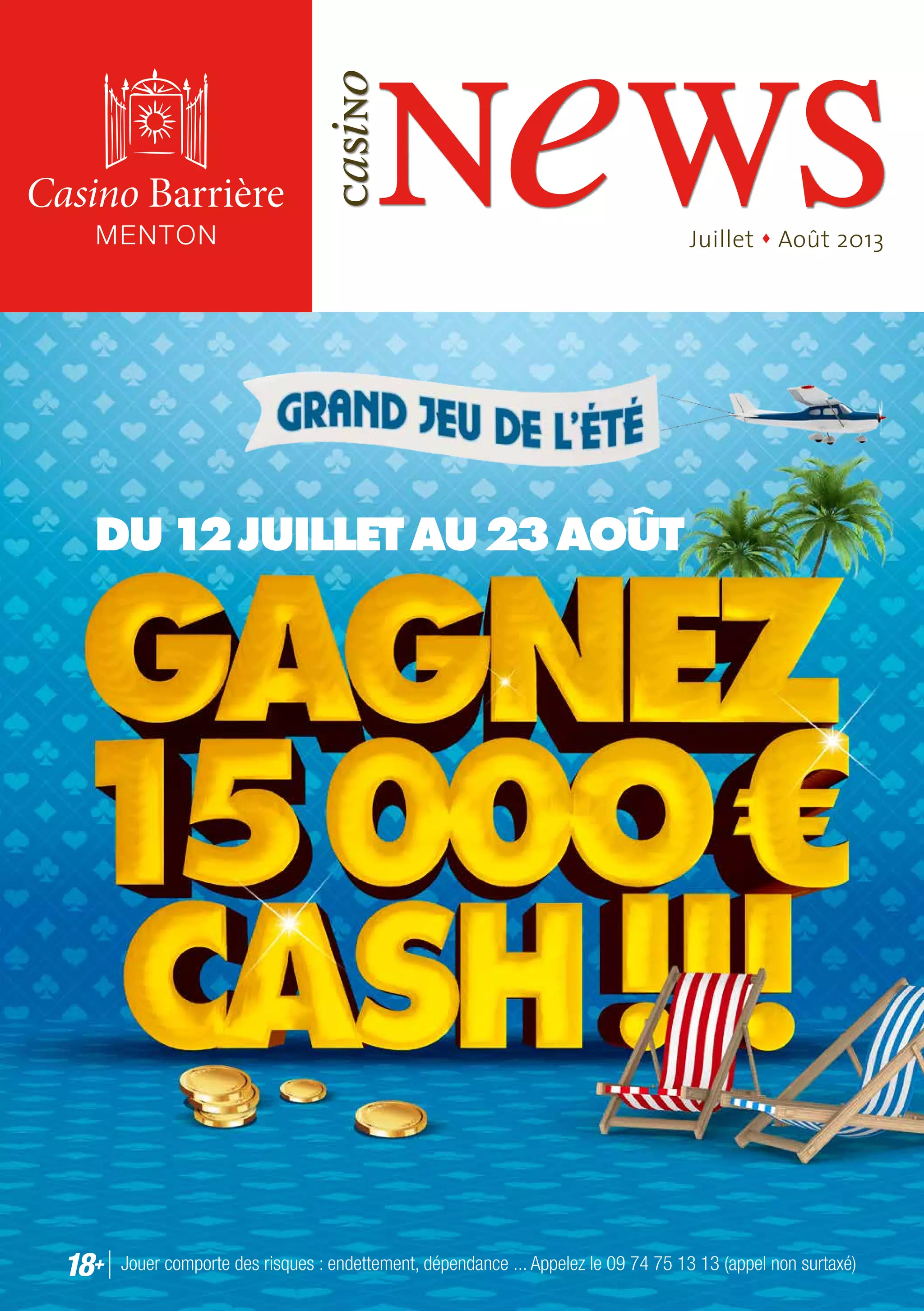 Le document présente une série de tournois de poker au casino Barrière de Menton, ainsi que des offres de bienvenue et des événements spéciaux durant l'été 2013. Il inclut des informations sur les droits d'inscription, les prix des jackpots, et des détails sur des dîners dansants et des animations estivales. L'accès aux jeux est réservé aux personnes majeures et nécessite la présentation d'une pièce d'identité.