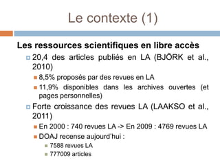 Le document analyse l'impact du libre accès sur la recherche scientifique, mettant en évidence une croissance significative des revues en libre accès et leur complémentarité avec les plateformes payantes. Les chercheurs en sciences humaines et sociales (SHS) perçoivent le libre accès comme bénéfique pour les découvertes inter-disciplinaires, bien que l'accès sans barrière n'encourage pas toujours ces découvertes. Enfin, des freins psychologiques et disciplinaires limitent l'intégration de concepts d'autres disciplines, malgré une reconnaissance du potentiel du libre accès.