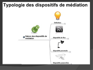Le document présente des réflexions sur la médiation numérique, soulignant le rôle des médiateurs bibliothécaires qui doivent accompagner et guider les utilisateurs. Il décrit divers outils et méthodes pour promouvoir la médiation numérique, tels que les réseaux sociaux, les blogs et les outils de curation. Enfin, il détaille les étapes et les considérations pour mener un projet de médiation numérique dans les bibliothèques.